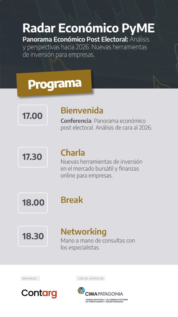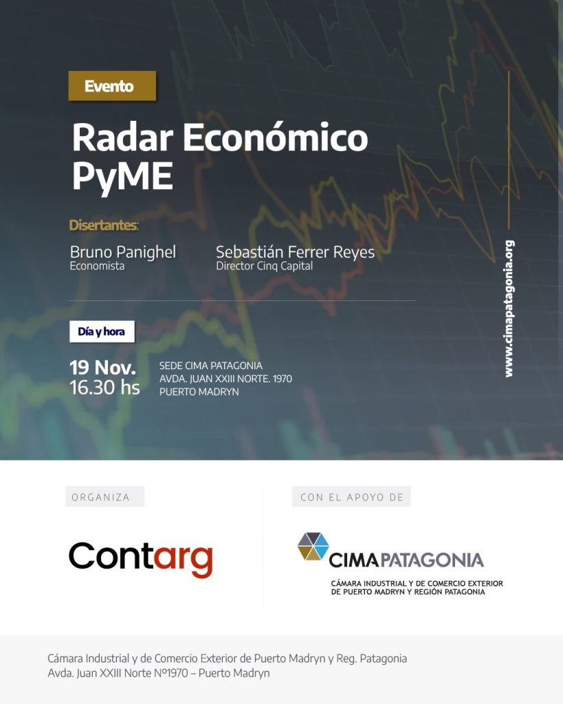 CIMA PATAGONIA, junto a la empresa Contarg, los invita a participar de un encuentro para comprender el escenario económico actual y conocer nuevas herramientas de inversión y financiamiento para fortalecer la competitividad de sus organizaciones.